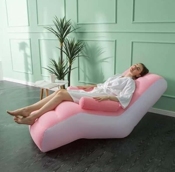 Transform any space into a relaxation oasis with this luxurious inflatable lounger in elegant pink and white. Ready to use in just 5 minutes, this comfortable recliner measures 137 cm x 76 cm x 86 cm, providing ample space to unwind. The ergonomic design features a contoured backrest and built-in armrests for optimal comfort. Quick and easy to inflate, simply select the appropriate nozzle, press it into the groove, and watch as your lounger takes shape. When not in use, it’s easily deflatable for compact storage and portability. Perfect for reading, meditation, or simply taking a peaceful break, this versatile lounger adds both style and functionality to any indoor setting. The durable construction ensures lasting comfort while the contemporary two-tone design complements modern décor. Ideal for home spas, relaxation rooms, or creating a cosy corner in your living space.