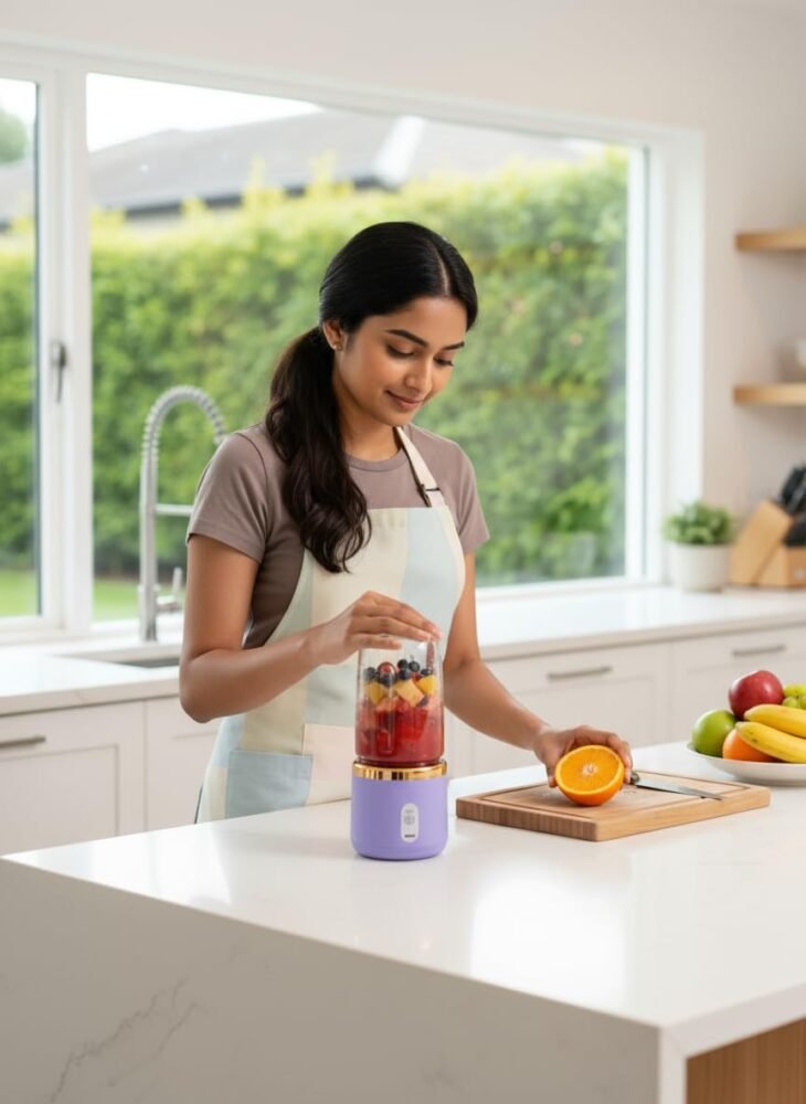 The Small Portable Juicer (400ml) is a sleek and convenient USB rechargeable blender designed for modern lifestyles. Whether you’re at the gym, office, or traveling, this compact juicer lets you prepare fresh juices, smoothies, or shakes anytime. Its powerful 6-blade stainless steel design ensures efficient blending, while the safety lock system prevents accidental operation. With a rechargeable battery and detachable bottle, it’s easy to carry, clean, and maintain. This is the perfect choice for health-conscious users who love freshness on the go. Frequently Asked Questions: Q1. Can I use this juicer to crush ice? A1. It’s suitable for soft fruits and light blending, but not recommended for crushing hard ice or frozen items. Q2. How many times can I use it after one full charge? A2. You can blend approximately 8–10 times on a single full charge. Q3. Is it safe to wash the motor base? A3. No, please avoid washing the motor base directly. Detach the cup and clean it separately. Q4. Can it blend vegetables or leafy greens? A4. Yes, it can blend soft vegetables and leafy greens when cut into smaller pieces. Q5. How do I know it’s charging? A5. The indicator light turns red while charging and green when fully charged.