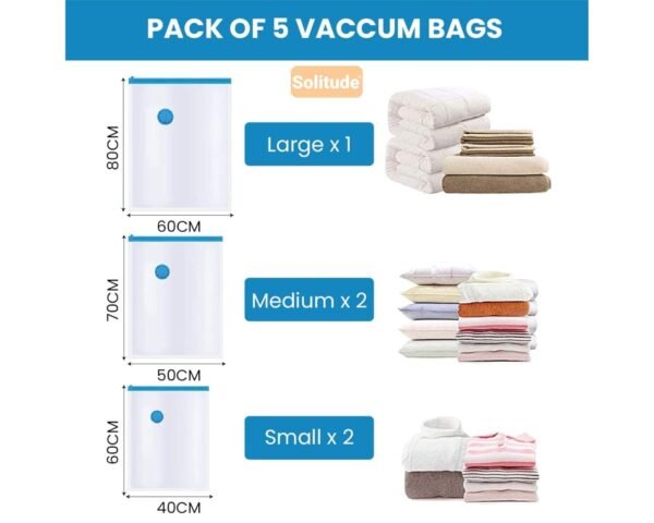 Solitude Reusable Vacuum Storage Bags (2S+2M+1L Bags, 1 Pump) for Clothes, Blankets and Bedding – Space-Saving Solution with Hand Pump for Travel and Home Storage